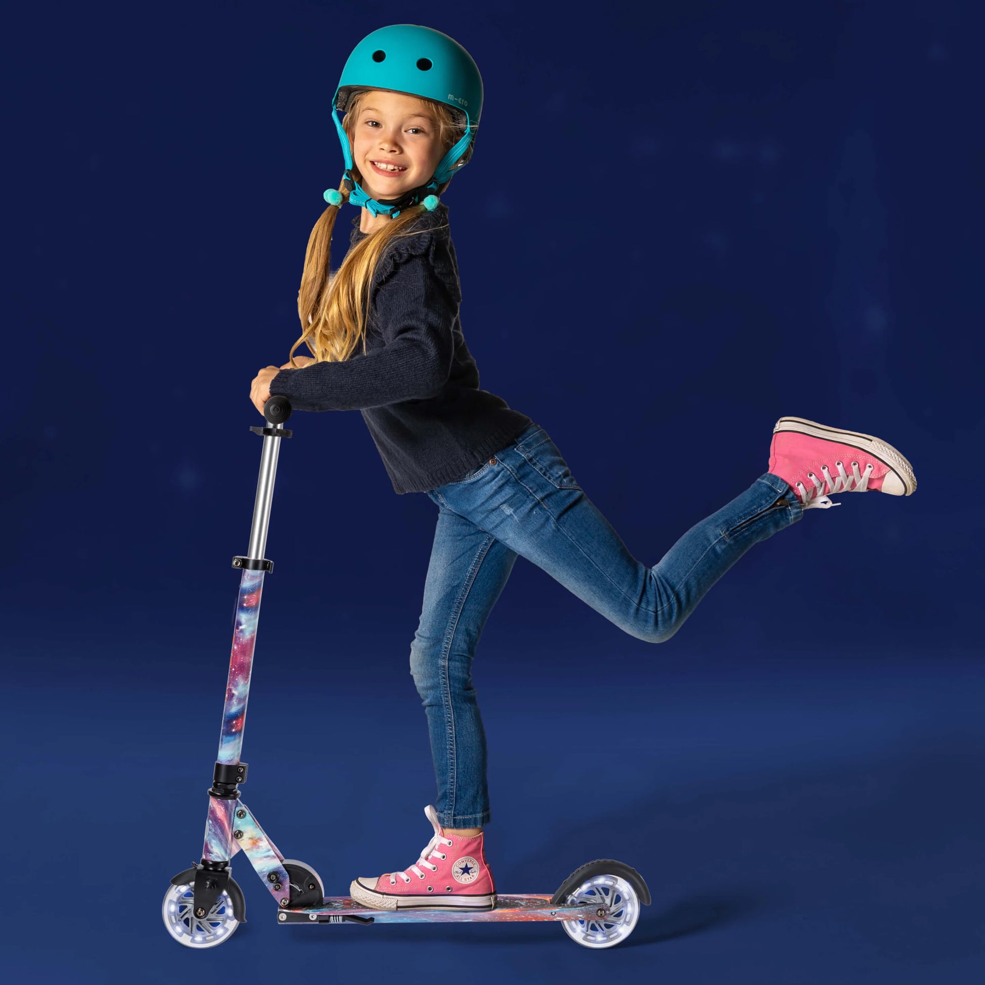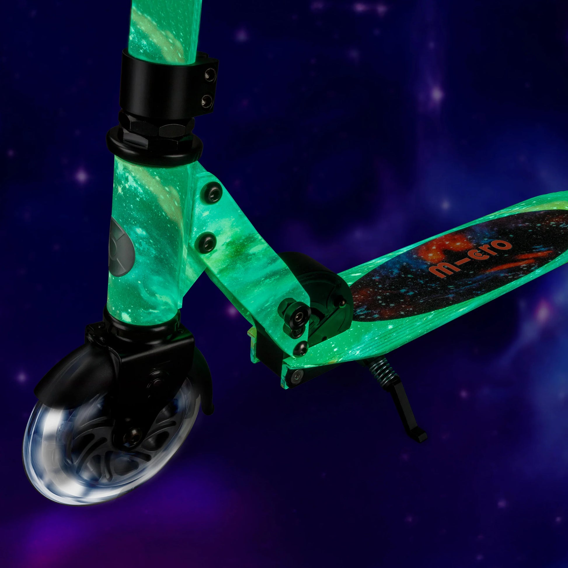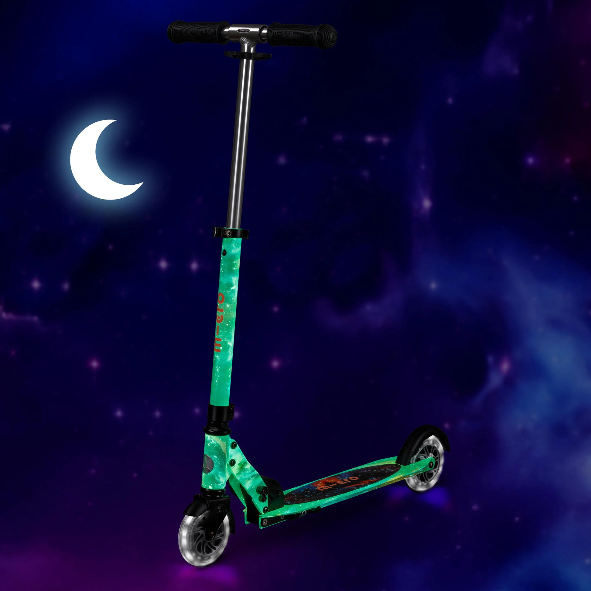 Lights that are powered by kids. Our ingenious induction powered LEDs are fuelled by the energy kids create as they scoot - producing bright white light to add some magic to every journey and help keep children safe on darker days.