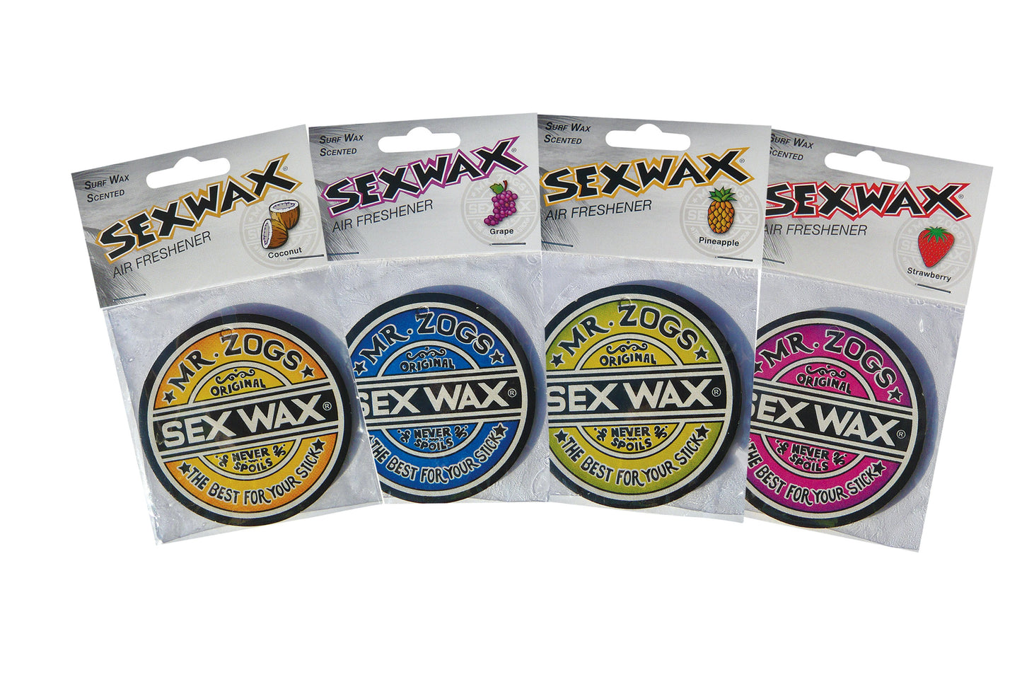 Bring the famous scent of Mr. Zogs Sexwax to your car, office or home with these delicious air fresheners. These scented packages remind you again and again of each good surf session. The Sex Wax Air Freshener is available in three summer scents: coconut, strawberry or grape.