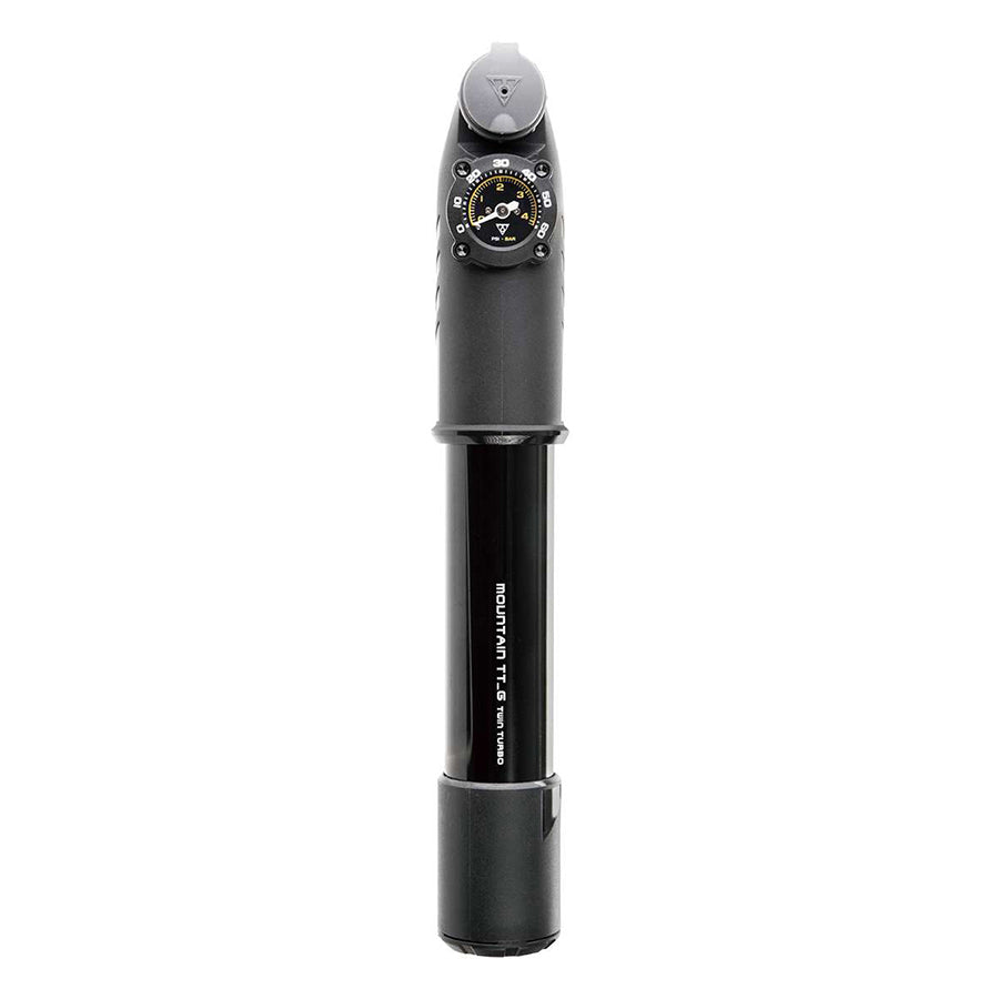 Mountain TT G Twin Turbo with large integrated 1-1/8'' diameter easy-to-read analog gauge pump fills both large volume fat bike tires and higher pressure MTB tires with ease. TwinTurbo technology uses both strokes to compress air to deliver high pressure output and saves time and effort. Integrated dust cap keeps pump head clean and thumb lock lever ensures air-tight seal.